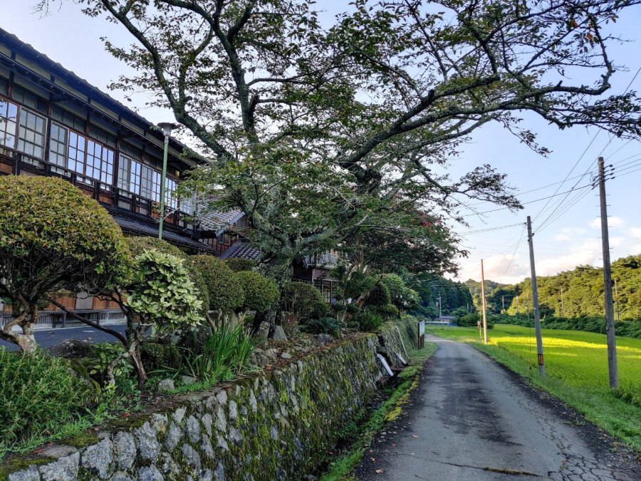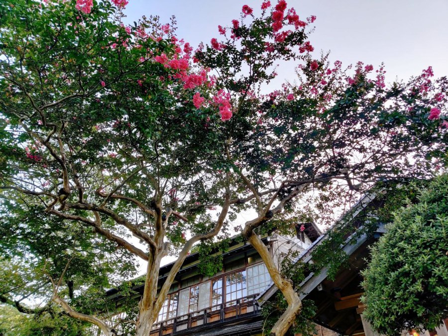 Föönasin tukan ja menin ulos. Aurinko paistoi matalalta, vesilammikot olivat kuivumaan päin. Riisi oli sateesta märkää, kukat jo varisseet keskikesän kuumuuteen. Paitsi kiinankutrio, joka kesän kuumimpana hetkenä vasta aloittelee vaaleanpunaista urakkaansa. Japaniksi puu on sarusuberi, apinan liukastuminen. Meillä on pihassakin yksi.